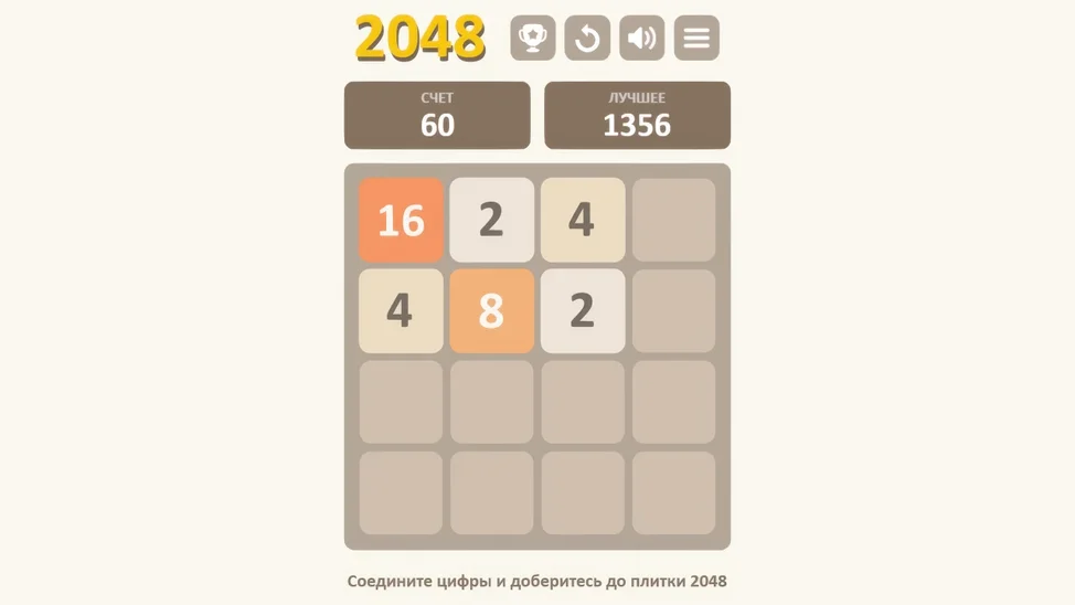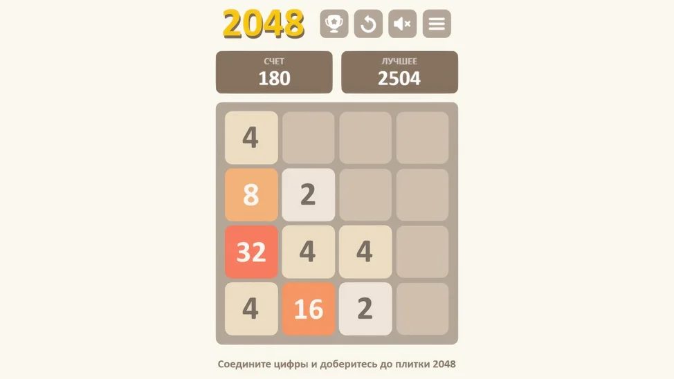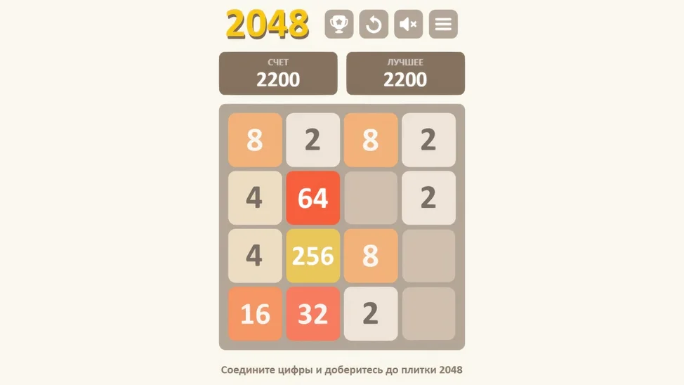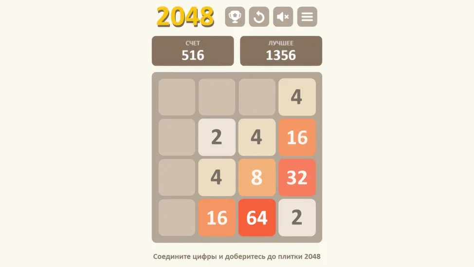 Игра 2048 — это увлекательная и простая логическая головоломка, в которой ваша задача — сдвигать плитки с числами по игровому полю размером 4x4 и объединять одинаковые числа, чтобы получить плитку с числом 2048. Каждое движение сдвигает все плитки в выбранном направлении, а при столкновении двух плиток с одинаковым числом они сливаются в одну с суммой этих чисел. Игра требует стратегического мышления и планирования ходов, чтобы не заполонить поле и достичь заветного числа 2048.