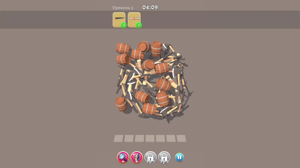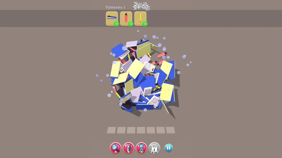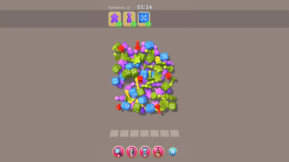 Выбирайте 3 одинаковых предмета, чтобы они исчезли с игрового поля. Уберите все предметы из списка на самом верху игрового экрана, чтобы пройти уровень.