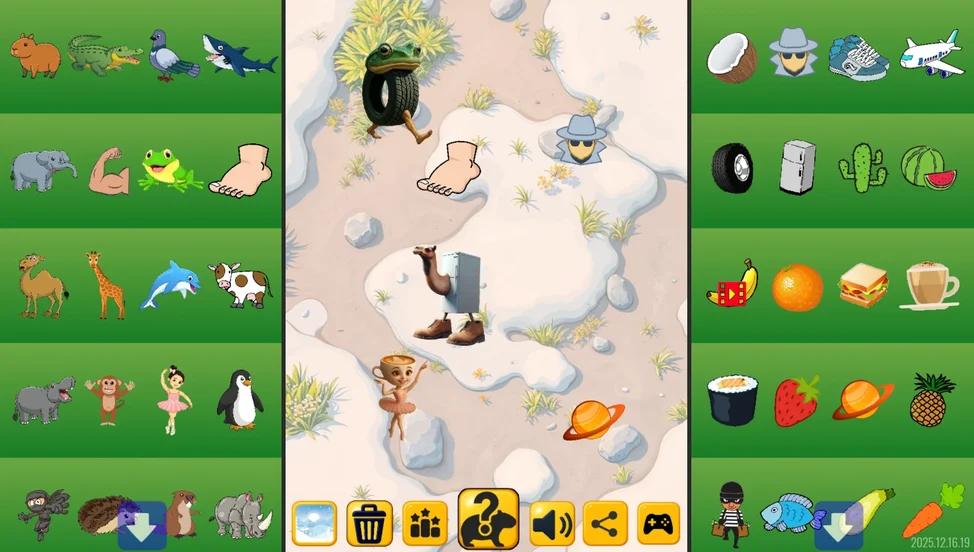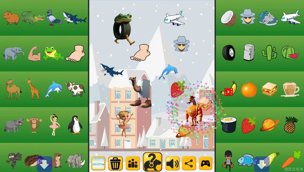 Твоя задача — экспериментировать! На левых полках ждут персонажи, на правых — самые неожиданные предметы. Перенеси пару на центральное поле и посмотри, во что они превратятся. Получил чашку капучино с телом балерины или бегемота-тостера? Поздравляем, ты создал нового брейнрота!