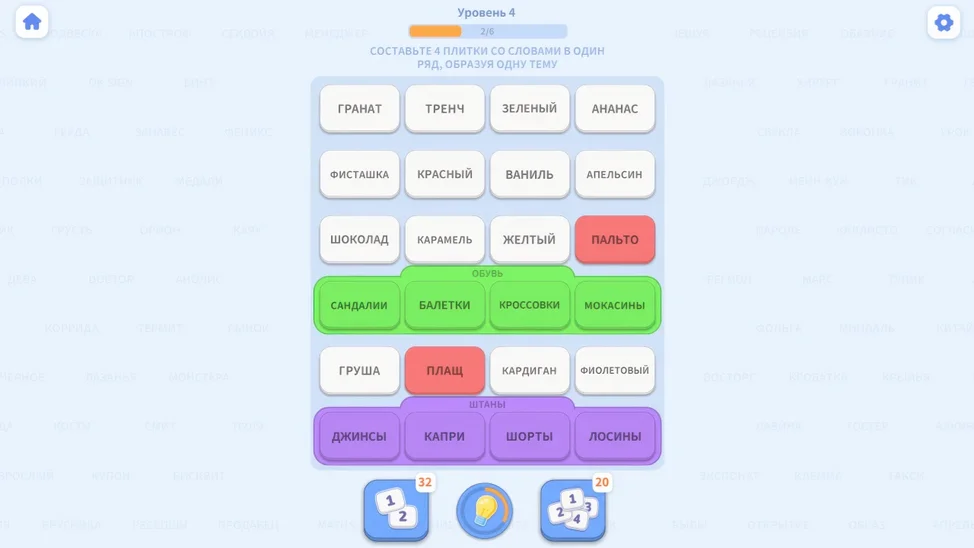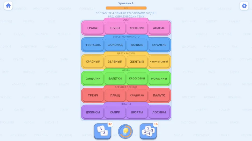 Погрузитесь в мир словесных загадок и ассоциаций! В нашей игре вам предстоит находить скрытые связи между словами и объединять их в логические группы. Каждый уровень — новая тема, новые слова и всё более сложные задачи. Игра развивает мышление, расширяет словарный запас и тренирует внимательность. Интуиция и логика помогут вам пройти десятки уровней, от простых до сложных, и стать настоящим мастером ассоциаций. Играйте в удобном темпе, без ограничений по времени, и используйте подсказки, если потребуется. Отличный способ весело провести время и прокачать ум!