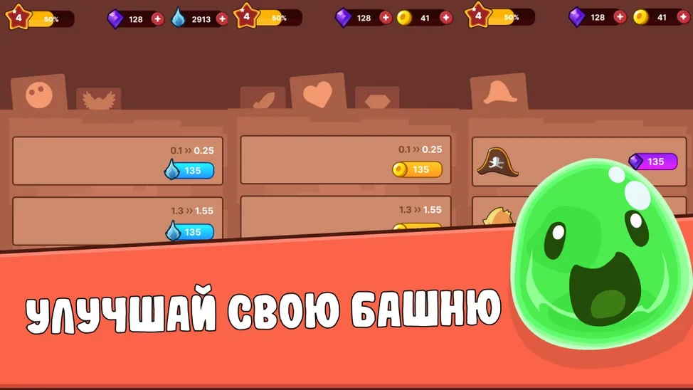 Повышая урон, ваша крепость сможет противостоять врагам, таким как взрывные снаряды, яды, двойные выстрелы и т. д. Повышение здоровья помогает вашей крепости выживать дольше с такими способностями, как вампиризм, регенерация, обратный урон и т. д. Повышение золота улучшает вашу экономику с преимуществами, такими как золото за каждую волну, скидки каждые 2 минуты, дополнительное золото после победы. Серебро покупает улучшения, доступные только во время битвы. Золото покупает улучшения, которые остаются с вами навсегда.