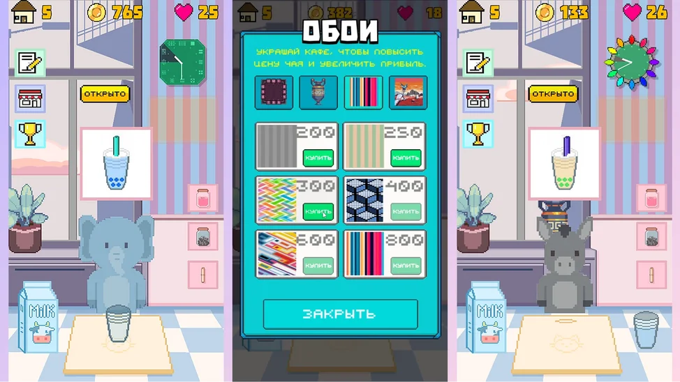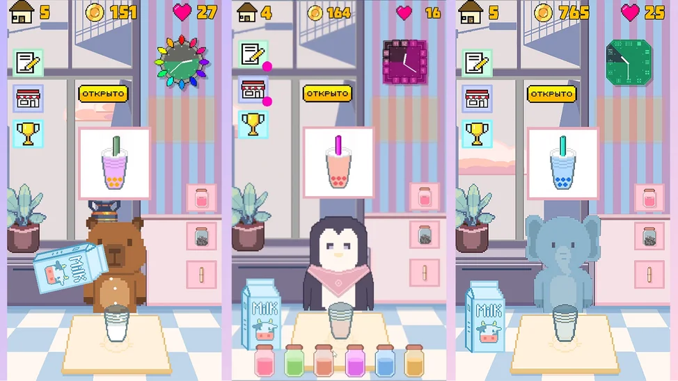 Боб-кафе для зверей. Мастер бабл-чая — это уютная пиксель-арт игра, которая не оставит равнодушной вашего ребенка. В ней ты становишься чайным мастером и готовишь вкуснейший бабл-чай для милых зверят. Выбирай из 6 видов чая, добавляй шарики тапиоки одного из 6 цветов и подбирай трубочку из 12 вариантов. Начни с трёх клиентов и увеличивай их количество с каждым уровнем, пока не встретишь всех 20! За правильные заказы получай монеты и лайки, а в магазине трать их на украшения для кафе: часы, вазы, картины и обои. Украшения повышают стоимость чая, а значит — и доход. Следи за временем смены на часах, выполняй задания и получай бонусы. Соревнуйся в таблице рекордов и докажи, что ты лучший бариста в городе!