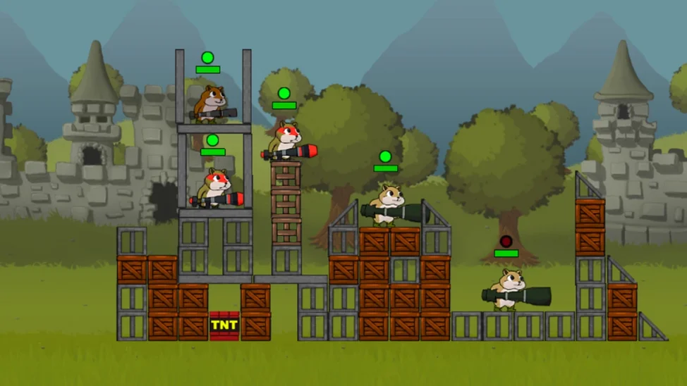 Вас ждут 40 интересных уровней — выбирайте свою стратегию, чтобы уничтожить врагов и сохранить боевой отряд. Вы можете использовать бойцов по одиночке, а также нанести массированный авиаудар по позициям врага. Забавная анимация, яркая графика, смешные хомячки увлекут вас с первой секунды. С каждым уровнем ваш отряд будет пополняться пушистыми бойцами и новыми видами оружия. Открывайте доступы к красочным локациям: пустыня, средневековый замок и многие другие места ожидают вас. Зарабатывайте очки и веселитесь на полную катушку!