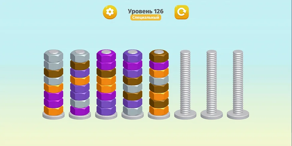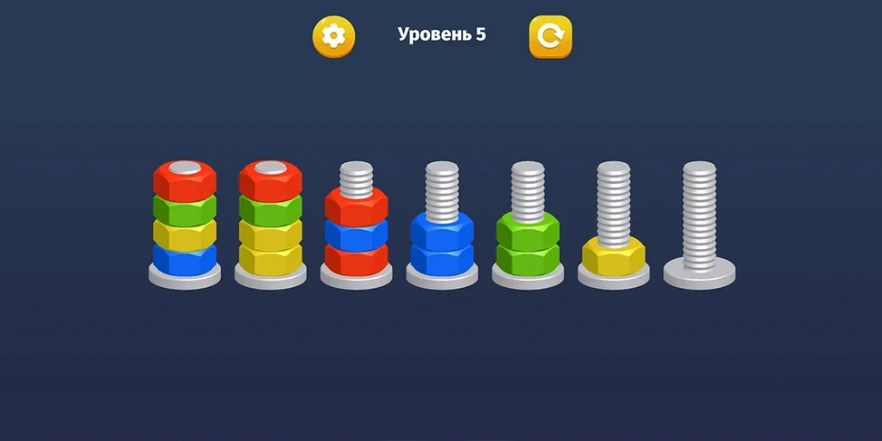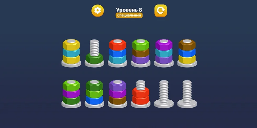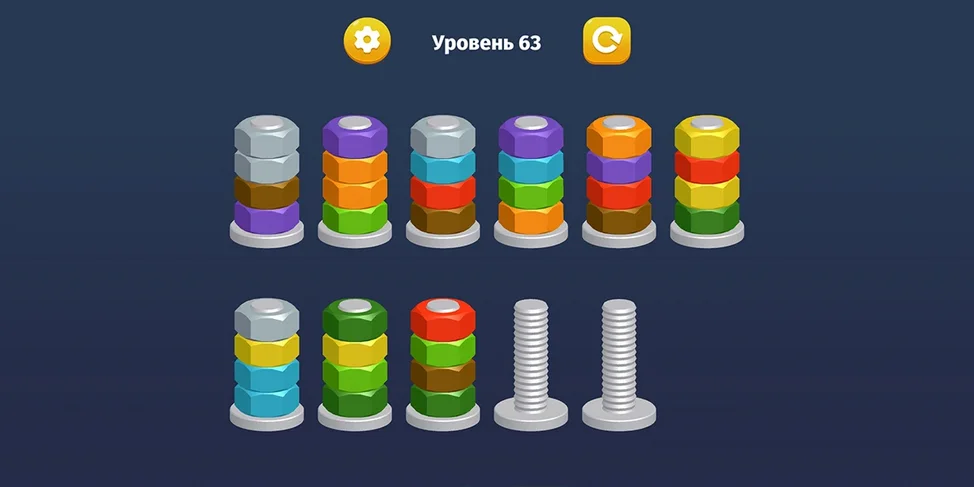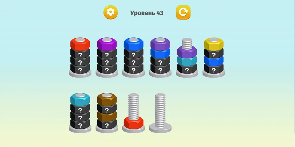 ✅ Цель игры - сделать так, чтобы все гайки одного цвета оказались на отдельных болтах.