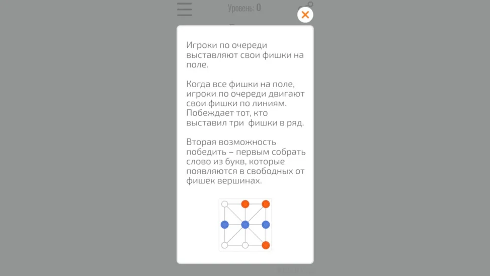 По очереди с противником выставляйте свои фишки на поле, стараясь выставить все три в ряд и не дать сопернику сделать это первым. Если это не удалось сделать сразу, двигайте свои фишки по линиям, чтобы выстроить в ряд. Попутно собирайте буквы, чтобы получить скрытое слово и выиграть даже в патовой ситуации.
