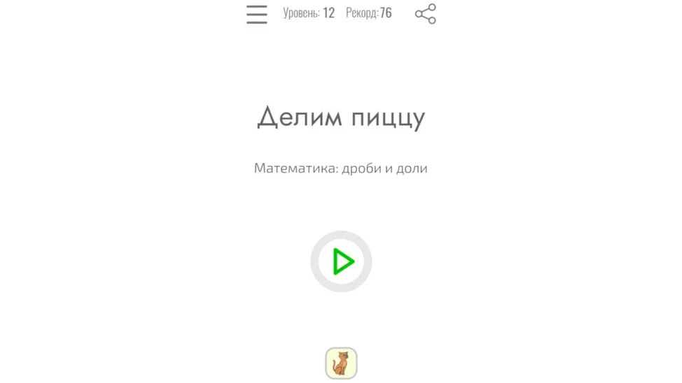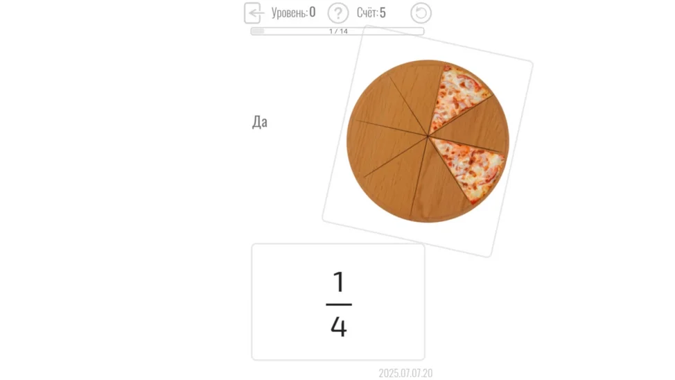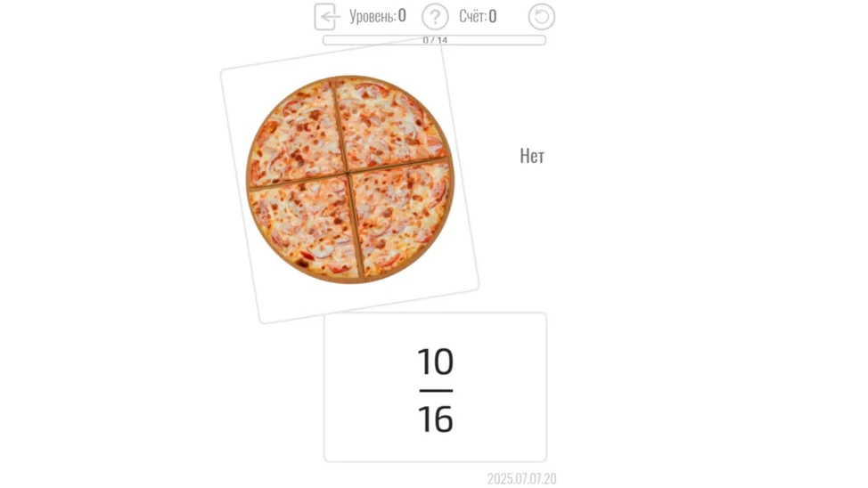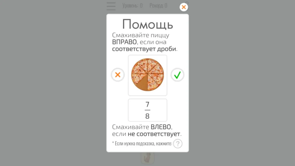 Смахивайте карточки с нарезанной пиццей влево, если изображение не соответствует написанной дроби. Смахивайте вправо, если соответствует.