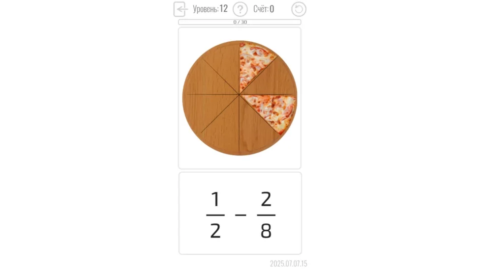 Арифметический тренажёр на тему дробей на примере нарезанной пиццы.