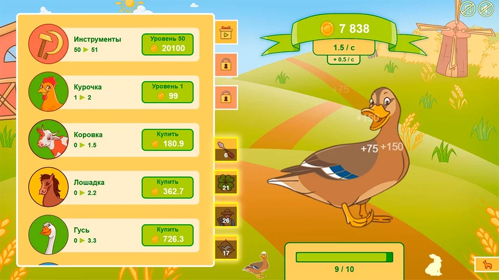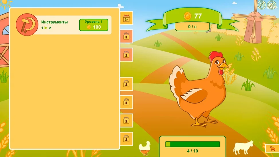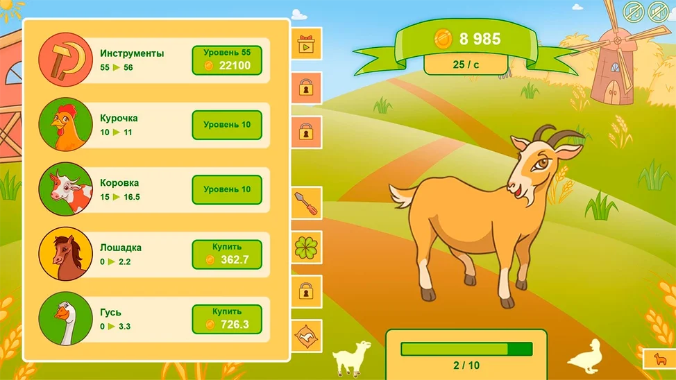 За монеты можно улучшать инструменты, что даст больше монет и прогресса за один клик, а также улучшать животных, что увеличит пассивный приток монет от каждого животного