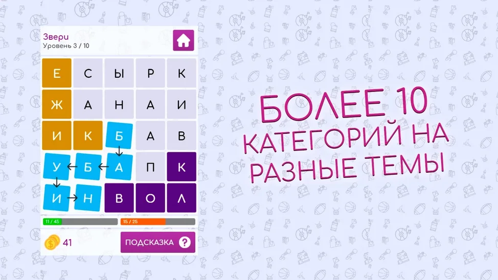 lanastern22 августа 2025По квадратной сетке расставлено какое-то количество слов, нужно найти их все. Чтобы выделить слово, нажмите мышкой/пальцем на первой букве и ведите, не отпуская, по всем буквам, отпустите на последней букве. Если оно выделено верно, то подсветится. Найди все загаданные значения и переходи на следующий уровень. Можно использовать подсказки, они помогут преодолеть все уровни. Разгадай все онлайн филворды и получи награду.