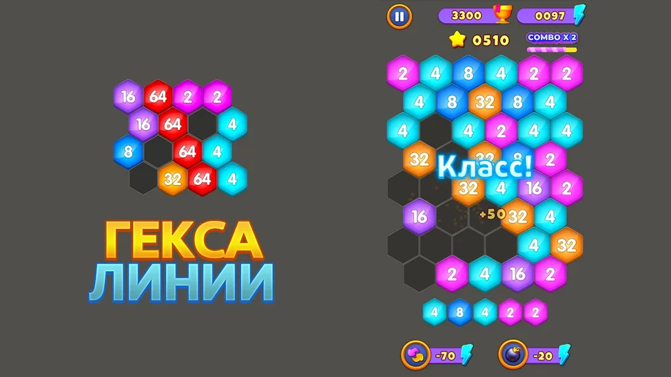 «Гекса Линии» - это головоломка, в которой нужно составлять группы из четырех и более шестиугольников одного числа. Игра сочетает в себе элементы популярных классических игр "Шарики линии" и "2048".