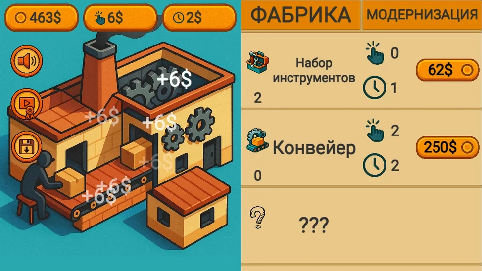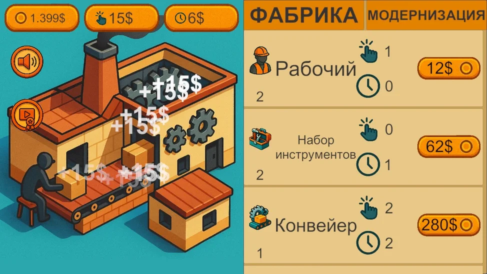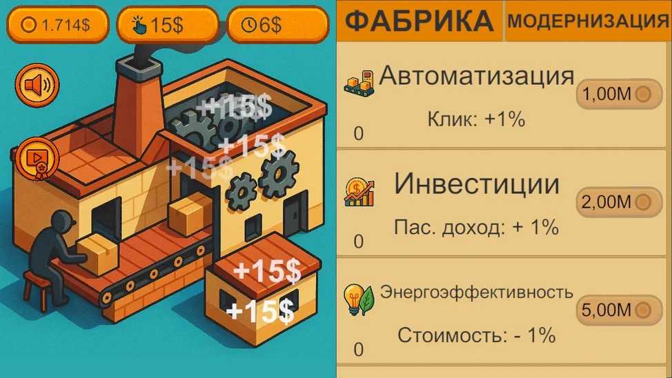 Зарабатывай деньги и развивай свою фабрику (зарабатывать можно нажатиями на экран, либо в пассивном режиме после покупки определенных элементов фабрики);