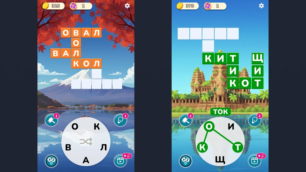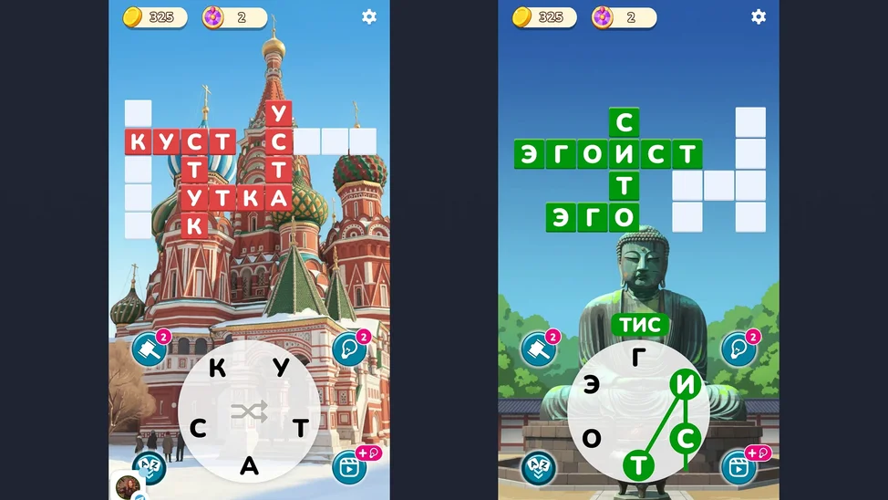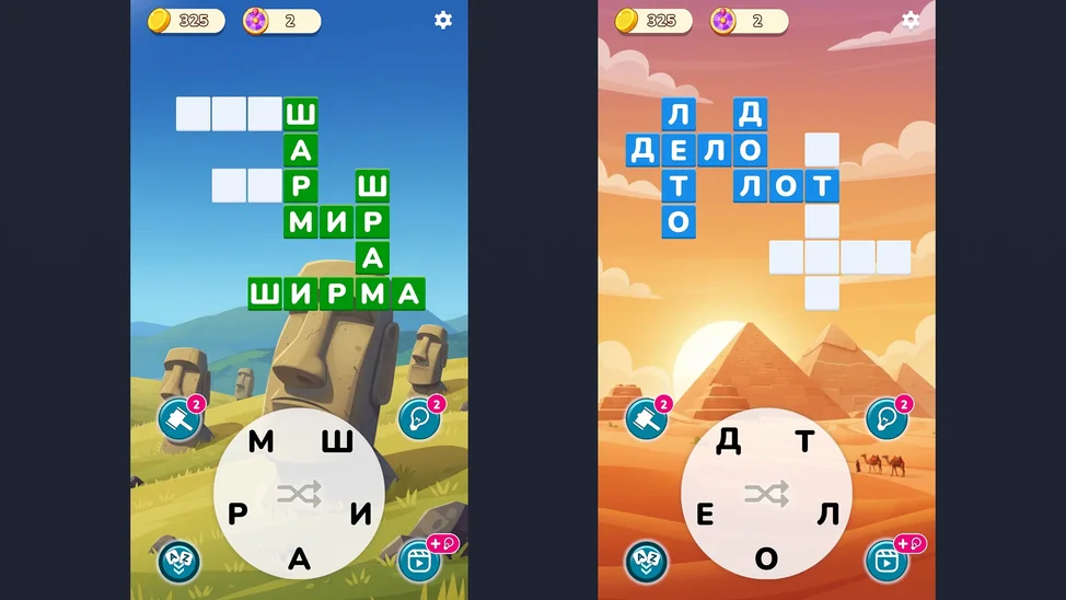 - Используй подсказки — лупу, перемешивание или открытие букв, чтобы справиться со сложными уровнями.