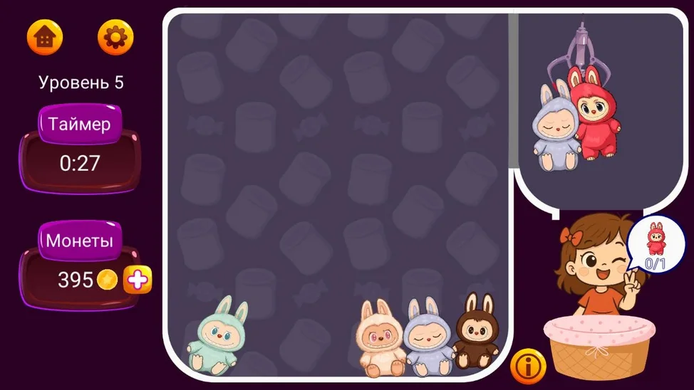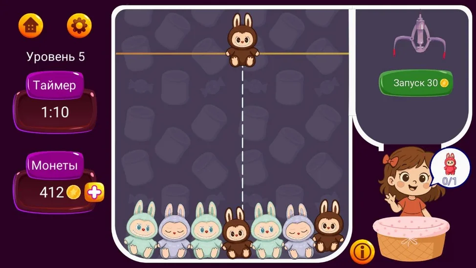 В этой увлекательной игре вы будете подбирать очаровательных кукол Лабубу, подбирать одинаковые и создавать новых персонажей! Когда два одинаковых Лабубу сталкиваются, они превращаются в следующую куклу в вашей коллекции. Зарабатывайте монеты за каждое слияние, а затем тратьте их на управление машиной для ловли когтей – выловите именно того лабубу, который вам нужен для прохождения каждого уровня!