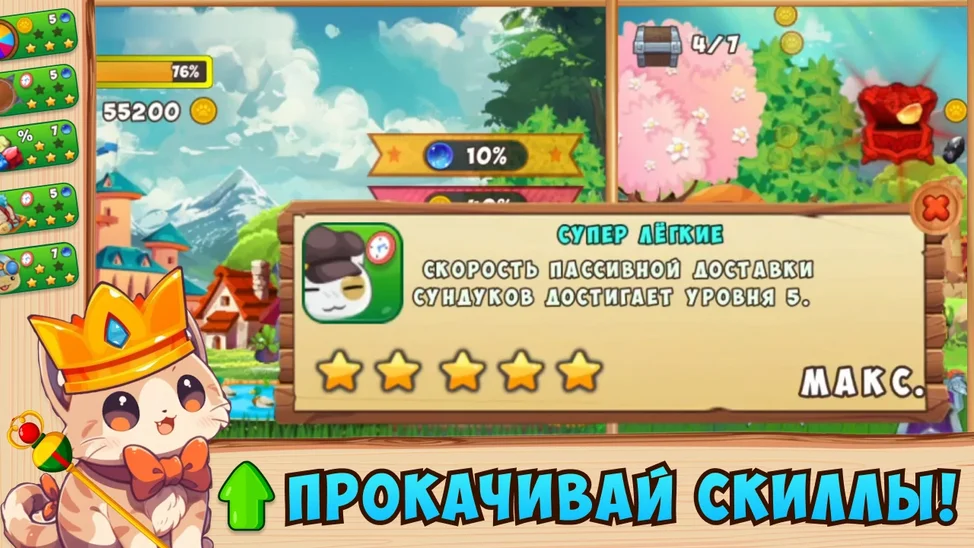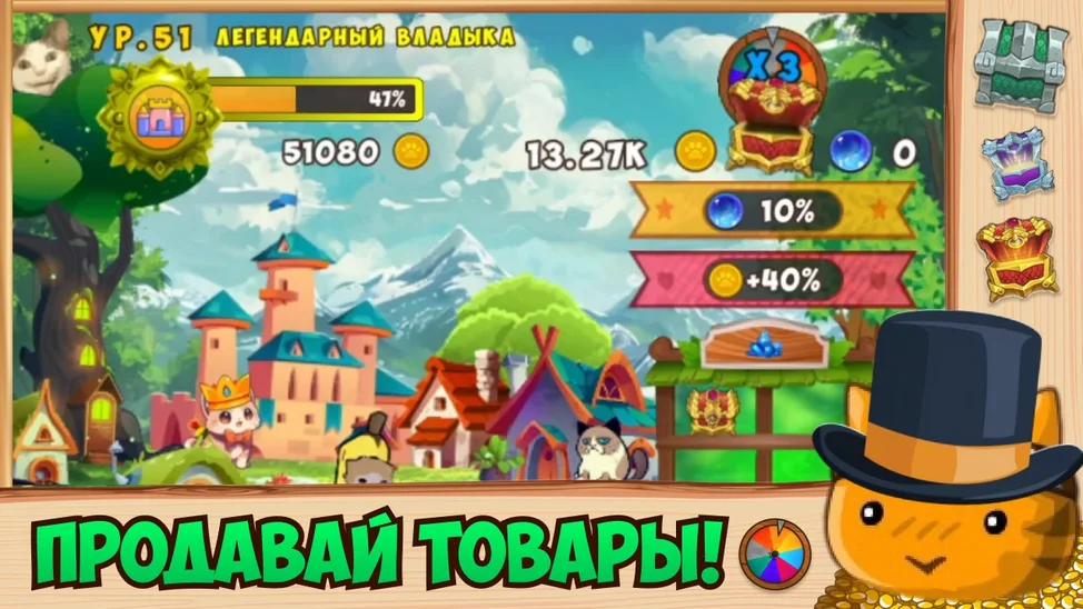 Подружись с Королём Котов и вместе с ним построй целое королевство! Окунись в красочный и увлекательный мир, где ты сможешь вовсю проявить свой ум и творчество!