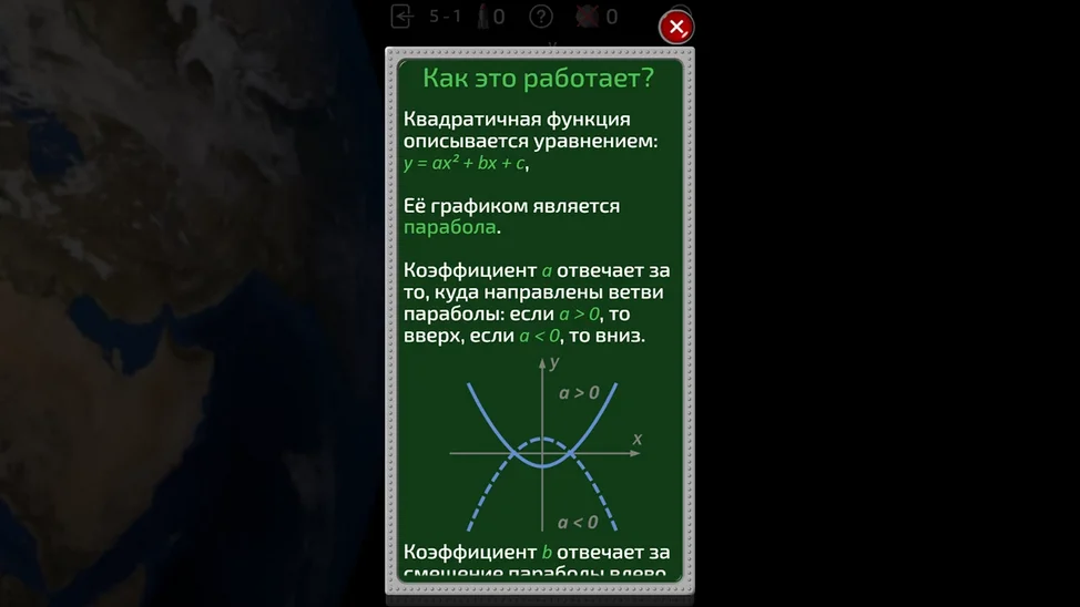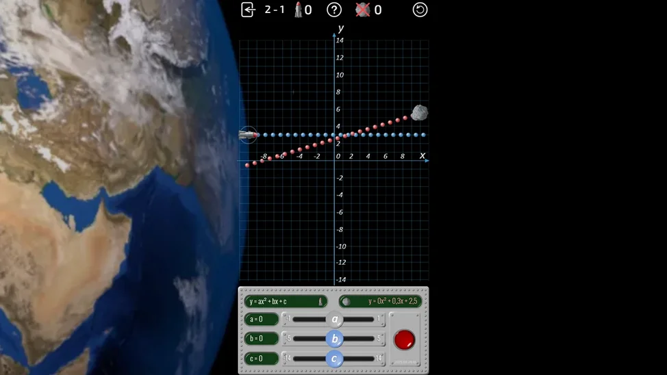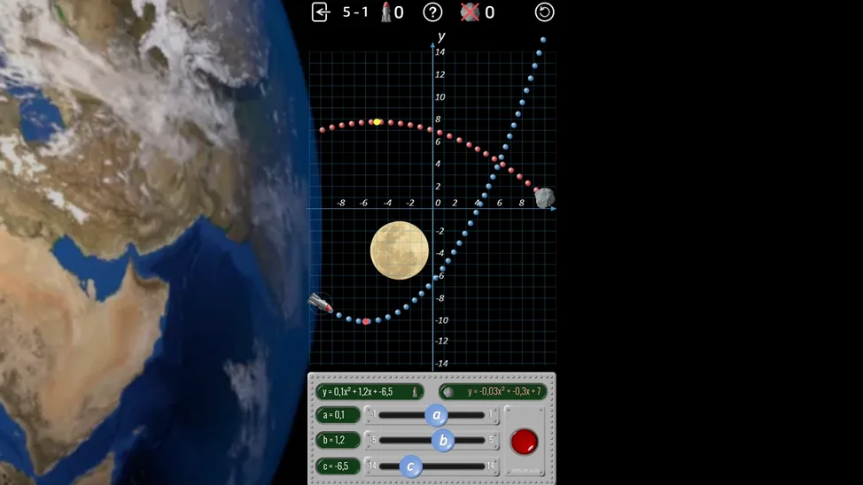 Математическая обучающая игра, посвящённая квадратным уравнениям. С помощью настройки уравнения игрок задаёт траекторию ракет, чтобы сбивать астероиды, угрожающие Земле.