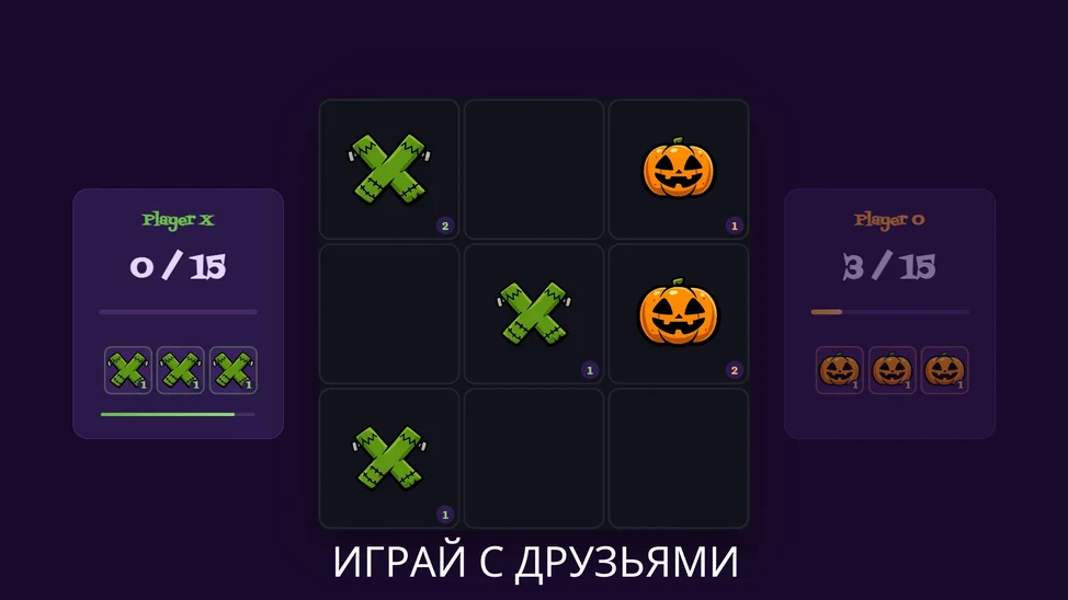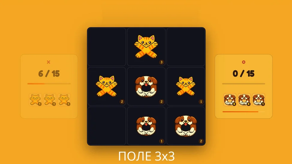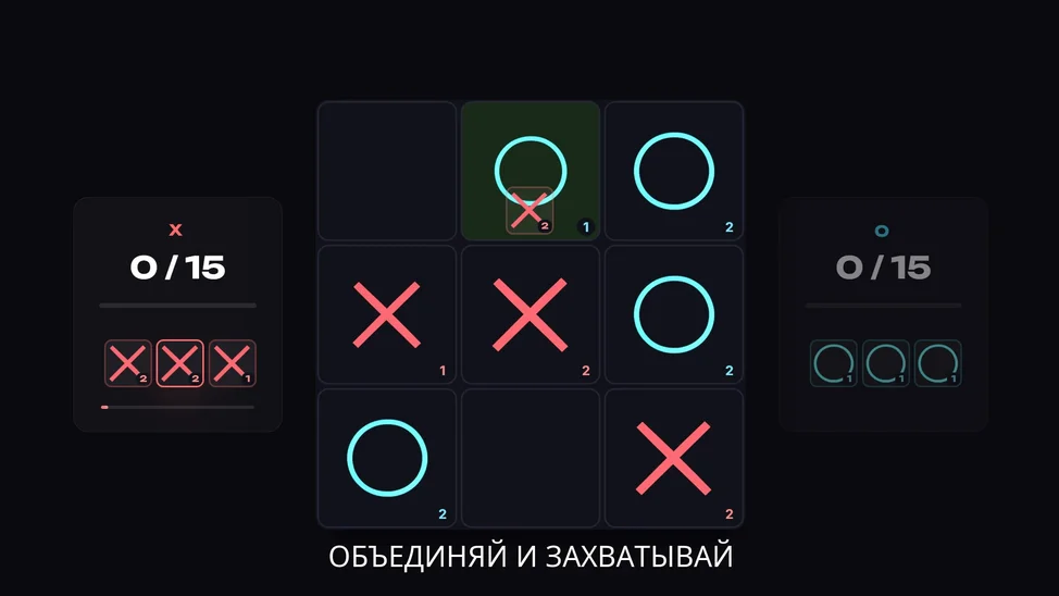 Крестики-нолики: Слияние — революционный взгляд на классические крестики-нолики! В отличие от обычной версии, каждая фишка имеет уровень силы от 1 до 3. Ставьте более мощные фишки, захватывайте слабые и контролируйте поле.