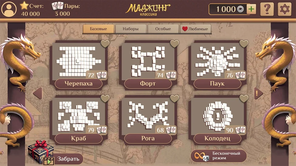 Выбирайте фишки с одинаковыми символами, чтобы их убрать. Особые фишки "цветы" считаются парными, и "сезоны" - парные. Фишку можно выбрать, если ее не блокируют другие фишки.