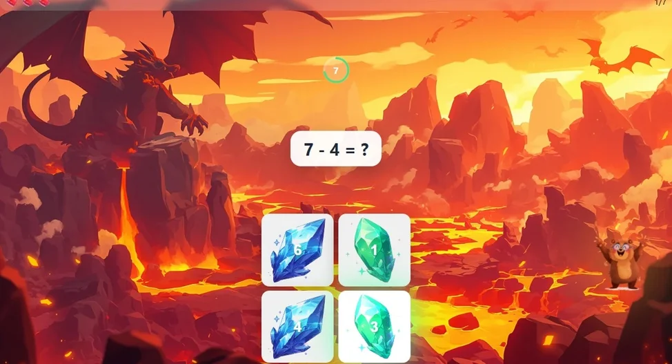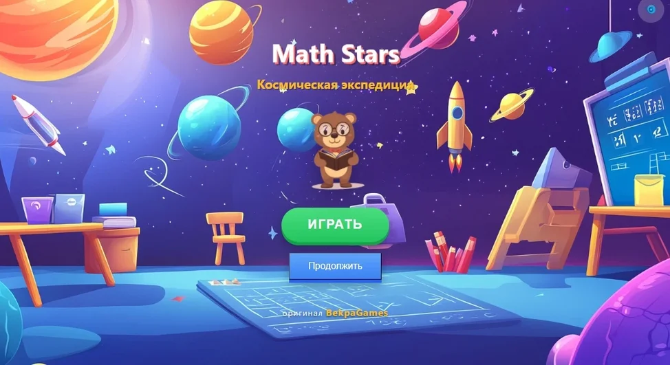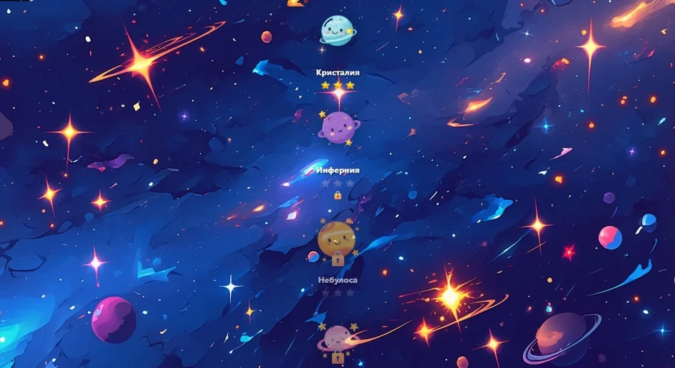 Звёзды математики: Космическая экспедиция - захватывающая образовательная математическая игра, разработанная для детей от 6 до 7 лет. Путешествуйте по галактике, посещайте красивые планеты и побеждайте космических боссов, решая примеры сложения и вычитания!