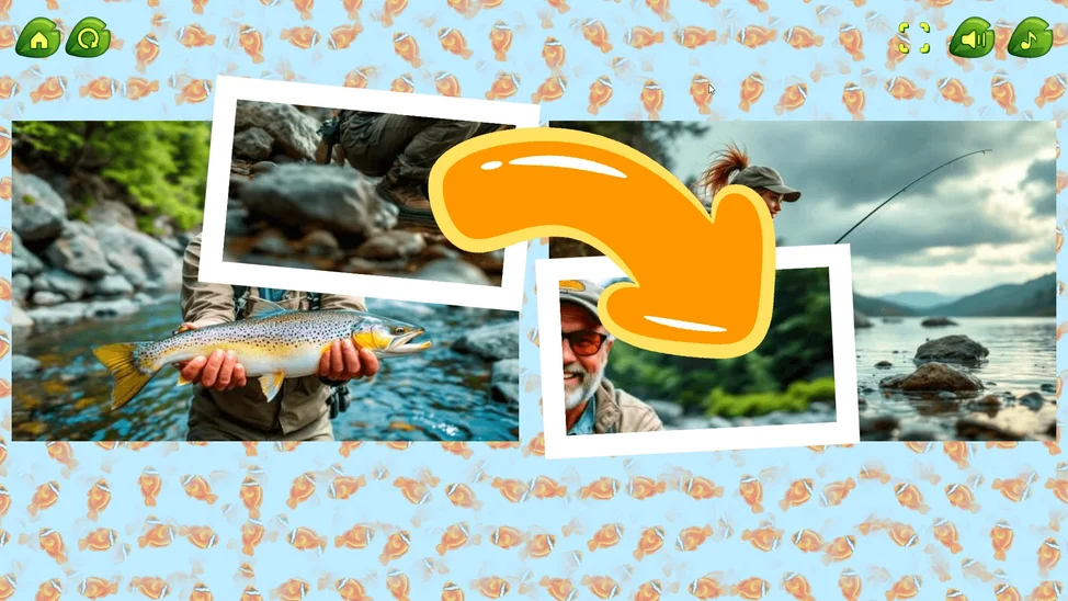 Микс Пазл: Рыбалка — яркая и увлекательная игра для детей! Картинки связанные с рыбалкой и обитателями глубин перемешаны. Ваша задача — собрать их, меняя местами фрагменты.