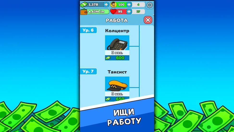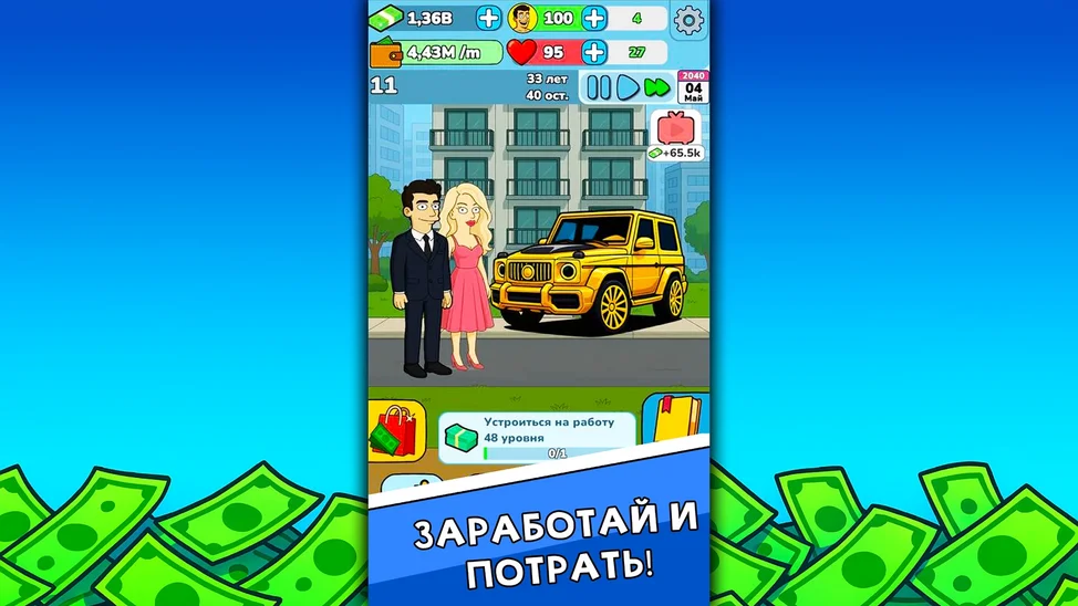 Стань миллионером с нуля в этом симуляторе жизни: работай, зарабатывай, инвестируй, покупай элитные дома и авто, строй отношения и развивай навыки. Делай смелые выборы и создай жизнь мечты — от нуля до вершины!