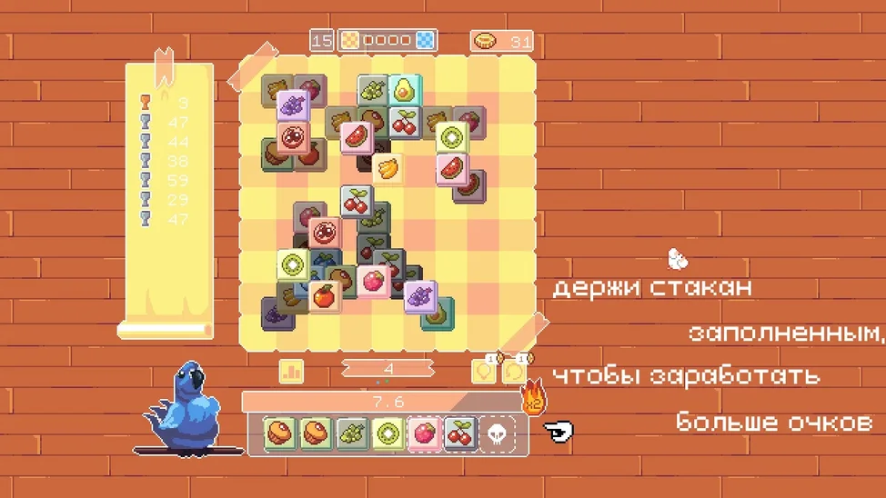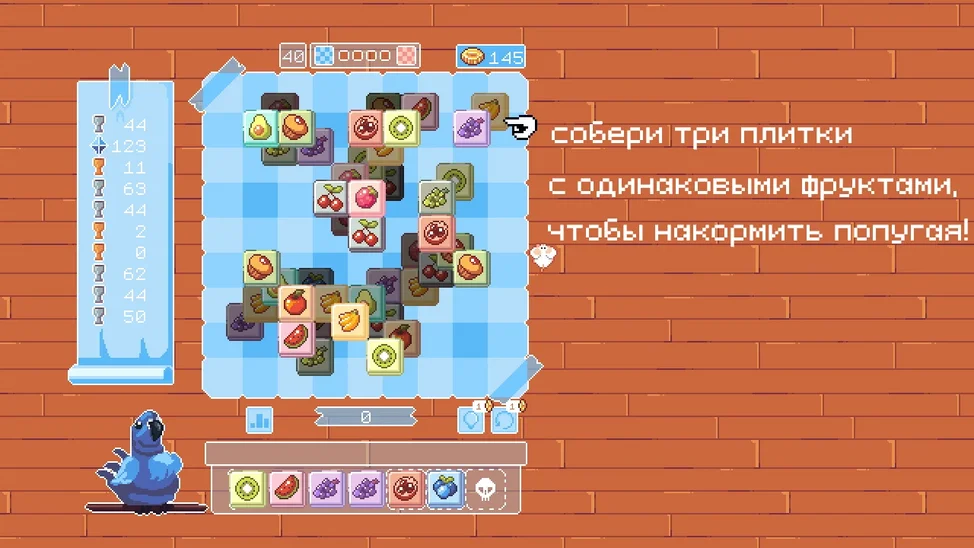 Привет! В этой увлекательной игре вам предстоит помочь милому попугаю насытиться вкусными фруктами. Соединяйте одинаковые плитки с фруктами чтобы очищать игровое поле и открывать новые уровни, соревнуйтесь с другими игроками, получайте удовольствие от яркого пиксель-арта и комфортного уровня сложности головоломки. Каждая игровая сессия предлагает уникальные задачи и красочные фоны, создавая атмосферу веселья и расслабления - игра прекрасно подойдет для того чтобы отдохнуть после долгого рабочего дня. Развивайте свои логические навыки, наслаждайтесь яркой графикой и радуйте попугая разнообразными угощениями!