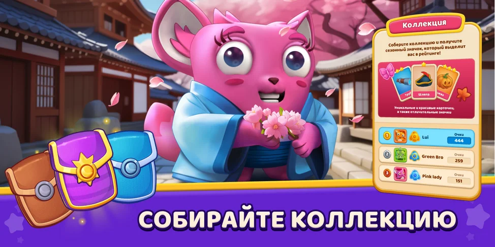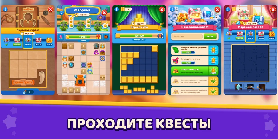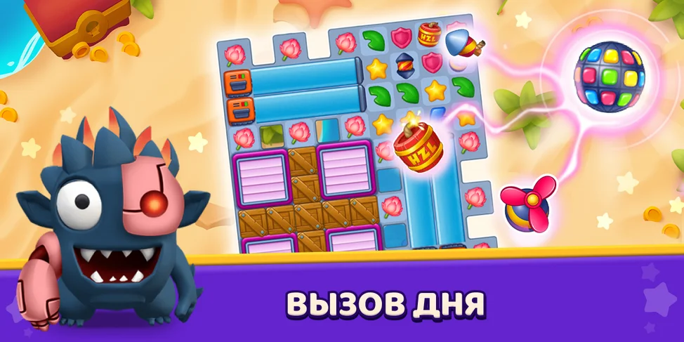 Чтобы пройти уровень, соединяйте три и более одинаковых фишек в ряд. Меняйте фишки местами свайпом, собирайте комбо и активируйте усилители — они помогают быстрее достигать целей. На каждом уровне есть свои задачи: собрать нужные предметы, разрушить преграды, активировать специальные элементы или набрать определённое количество очков.