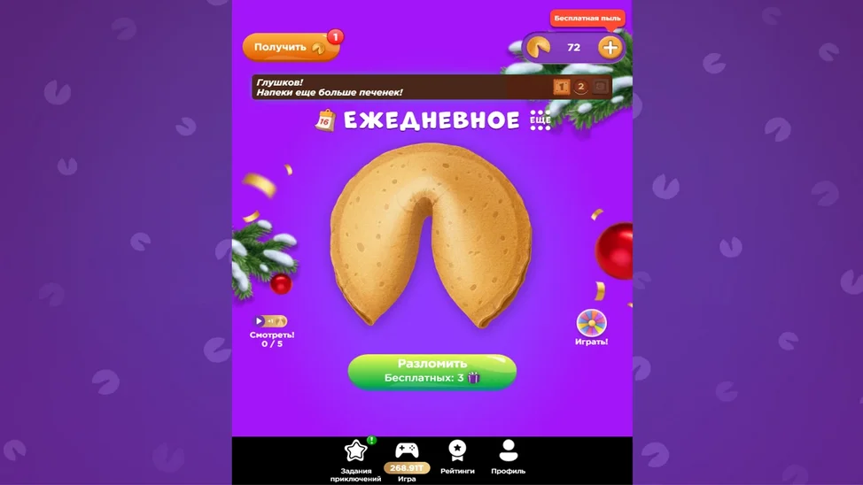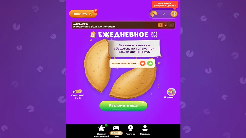 Каждый день тебя ждёт магическая печенька с предсказанием! Разломи её и узнай, что приготовила для тебя Судьба. Накопи несколько печенек, чтобы получить особое послание в категориях «Любовь», «Финансы», «Карьера» или «Друзья».