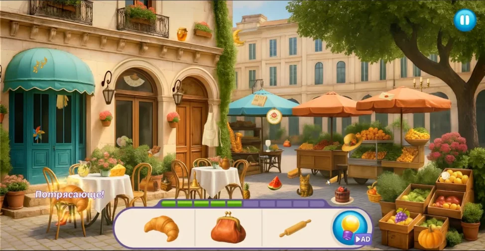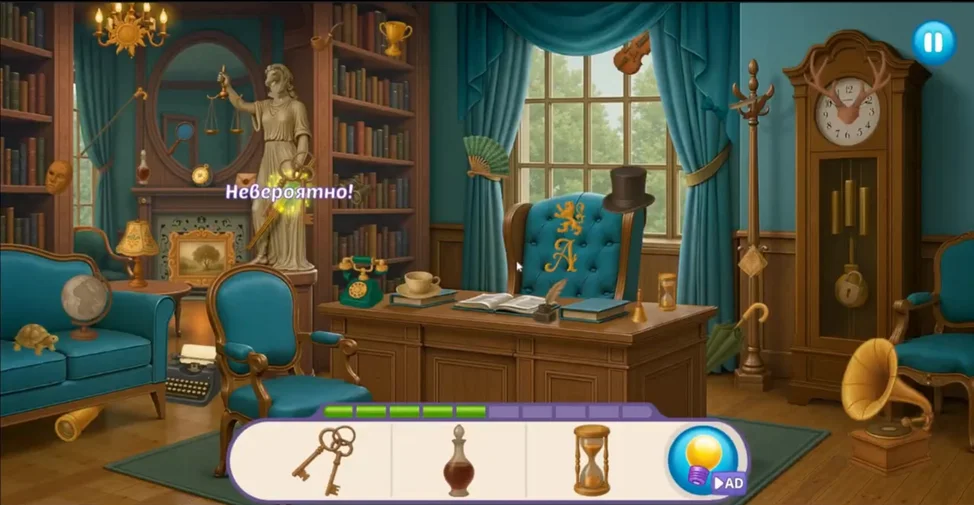 Вы можете пропустить головоломку или выделить трудно находимый объект, посмотрев рекламу - просто коснитесь иконки лампочки на панели целей