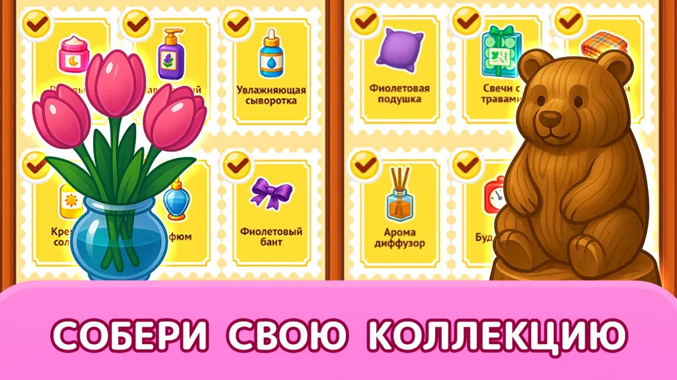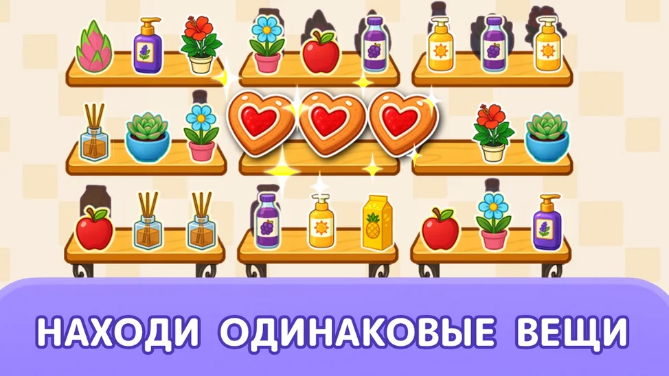 🧩 Соединяй одинаковые вещи по три, освобождай место и продумывай ходы, чтобы открыть ряды за ними.