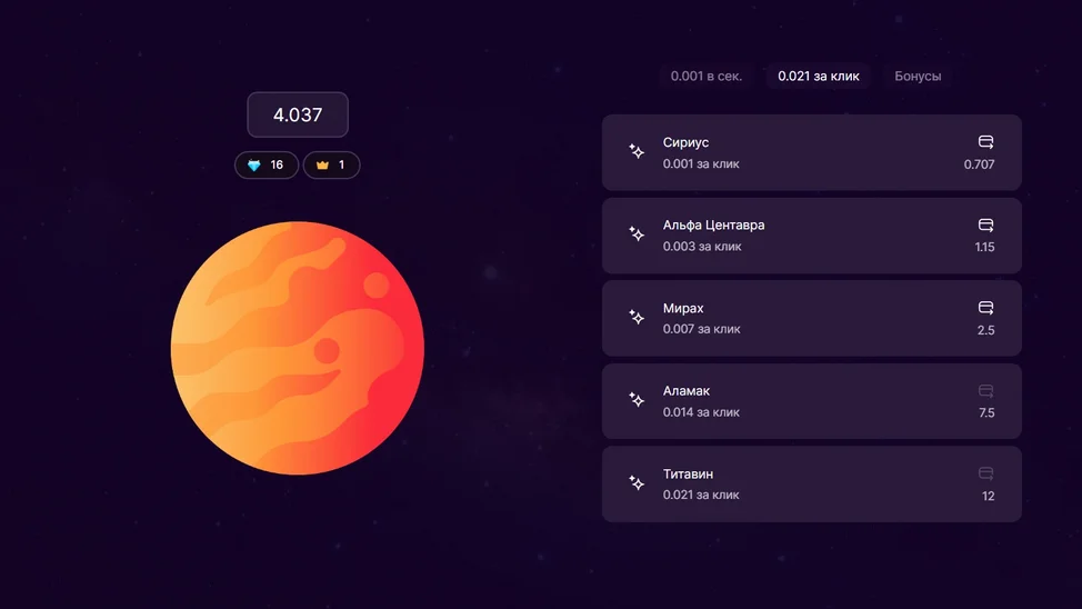 Монеты можно тратить в магазине. При старте будет доступно 0.1 монет. На них сразу можно купить звезду «Сириус», чтобы прокачать доход за клики.