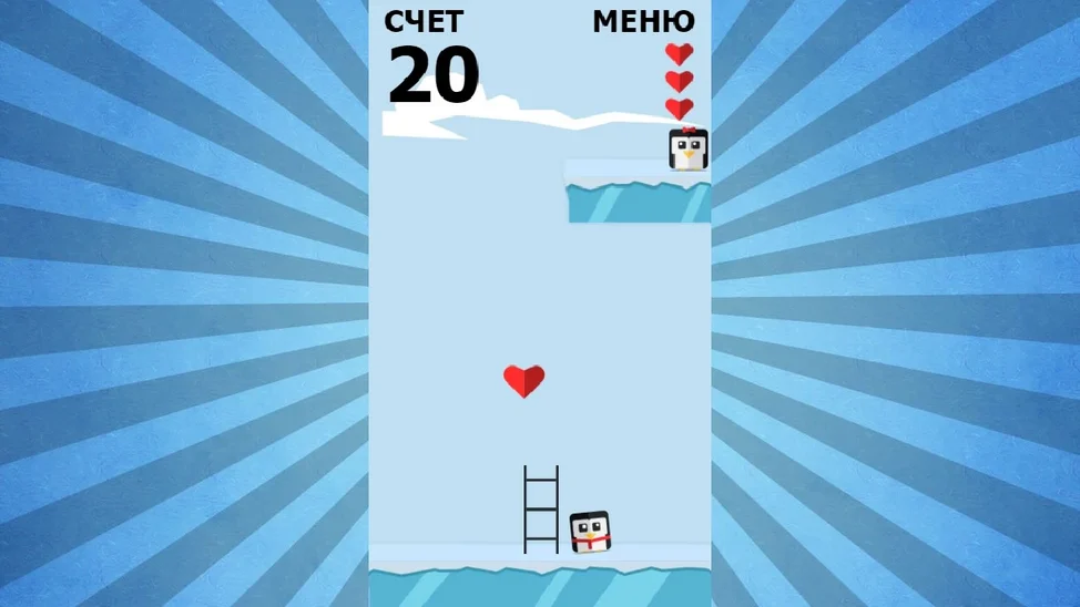 Уворачивайтесь от льдинок и собирайте сердечки, чтобы построить лестницу. Постарайтесь набрать как можно больше баллов.