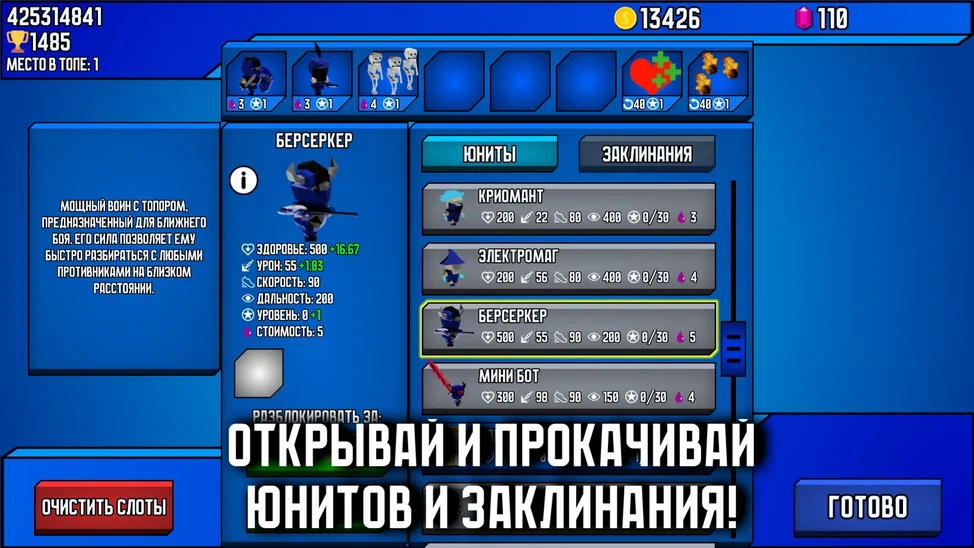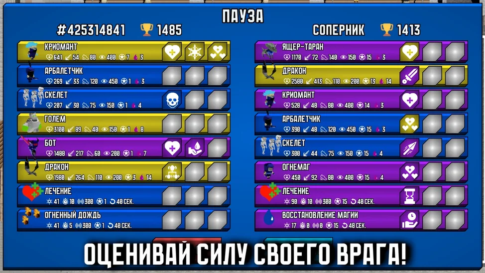 AngelaStorm22 апреля 2025Ваша цель — уничтожить башню врага и захватить контроль над центром арены. Испытайте свои силы в трех уникальных режимах: рейтинг, столкновение, выживание. Чтобы перехитрить врага, нужно использовать логику, внимание и постоянную смену стратегии — это не так просто, как кажется на первый взгляд. Улучшайте юнитов и заклинания, наслаждайтесь приятным геймплеем и простым управлением. Одолейте своего врага в противостоянии на арене. Игра завершается либо разрушением башни противника, либо по истечении времени, если ни одна база не упала. Побеждает игрок с наибольшим количеством очков центра. Станьте первым в списке лидеров. Желаем увлекательной игры!