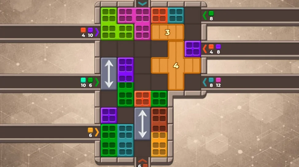 Перемещайте фигуры к конвейерам с кубиками. Если цвет кубиков совпадает с цветом фигуры, она начинает заполняться. Когда фигура полностью заполнена кубиками, она исчезает с уровня.