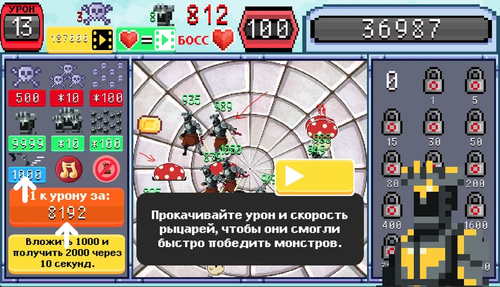 В начале игры у вас будут существа и стол низкого качества, с каждым уровнем будет улучшаться стол, музыка и существа. На поле боя можно призывать рыцарей и монстров. Они призываются в случайную точку. Монстры наносят случайный урон. Рыцари редко могут нанести двойной урон. Ваша цель: открыть последнее существо и победить босса. Для достижения цели, можно часто нажимать на существ и соединять их, инвестировать в кузницу, ловить монеты, устроить бои или самому бить монстров нажимая по ним.