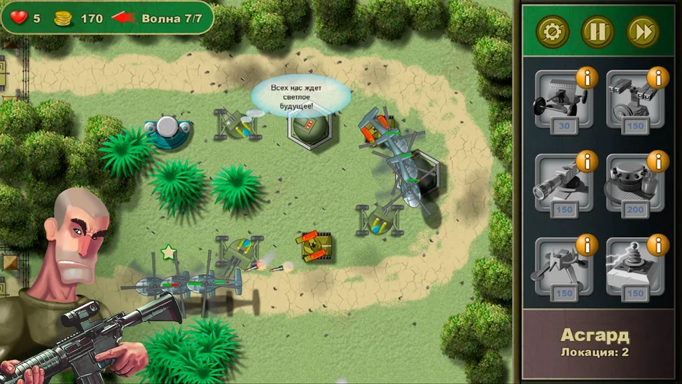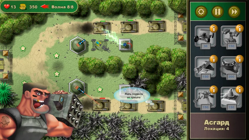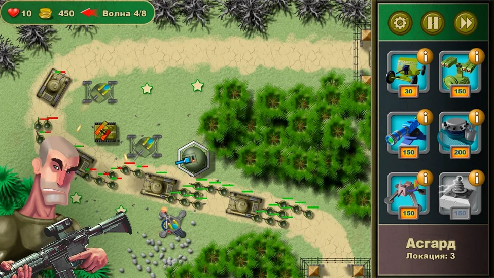 Veylevas27 мартаВам выпала миссия освободить островные станы, которые подверглись гнету захватчика. В арсенале вы имеете разнообразные башни: пулемёт, лазерная пушка, зенитная установка, азотная установка, огнемёт и тесла пушка. Повышайте их огневую мощь, чтобы победить в сражении. Также у вас есть доступ к магазину вооружений, в котором вы сможете приобретать технику.