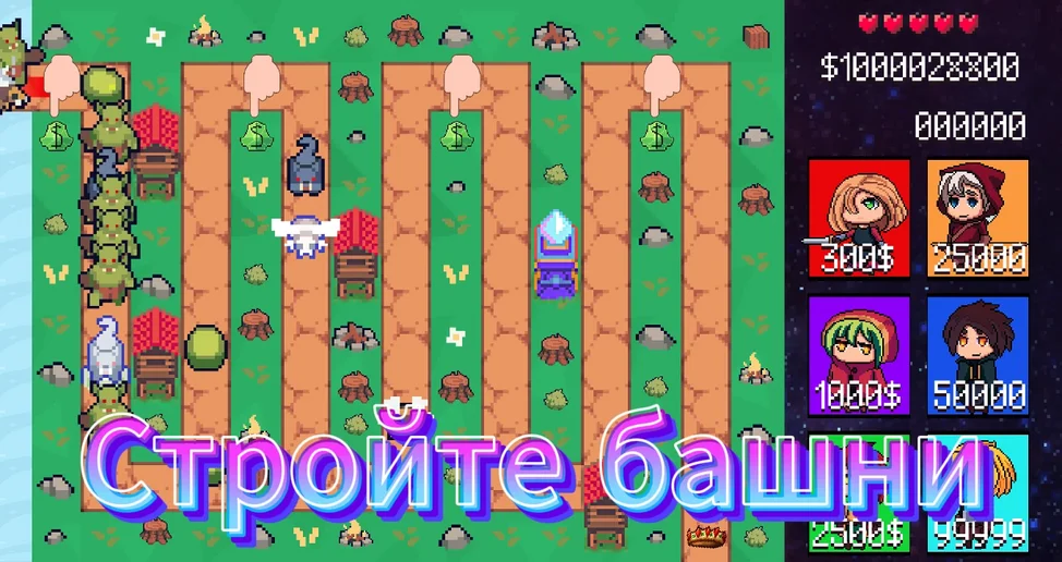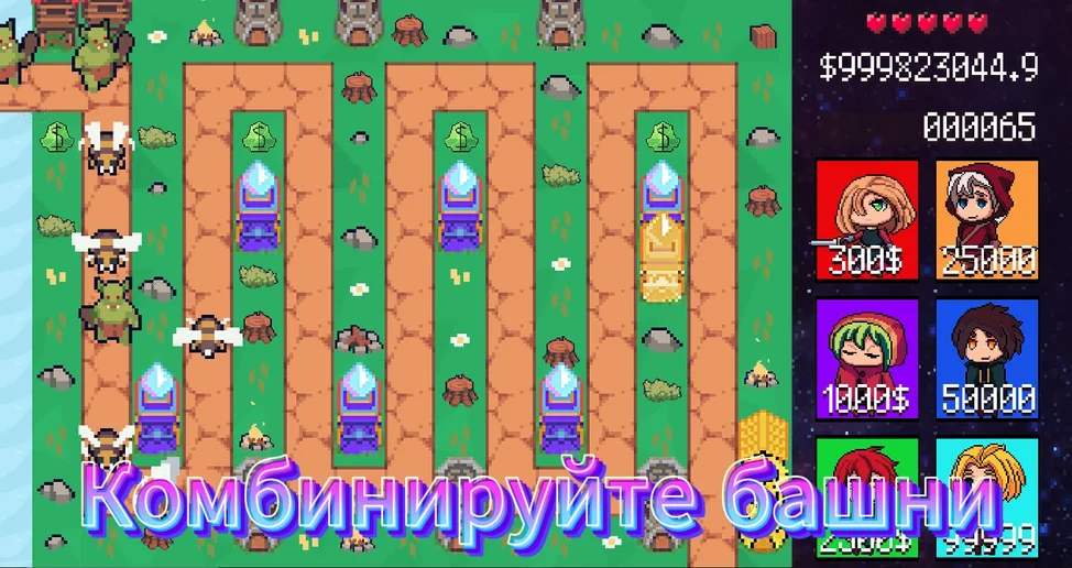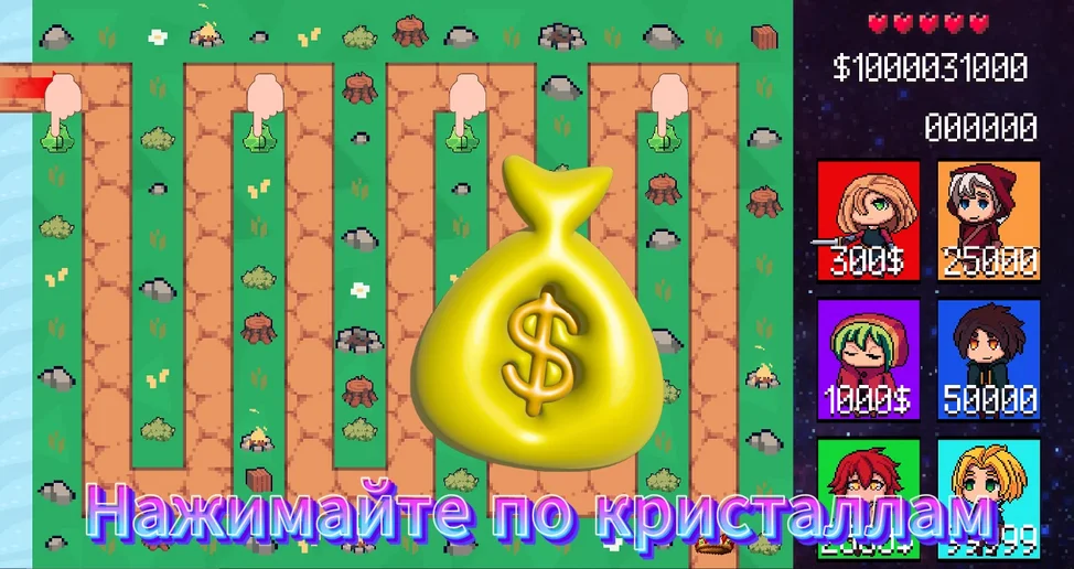 Вам предоставляются башни и кристаллы с деньгами, которые не дадут вам просто так сидеть и ждать деньги.