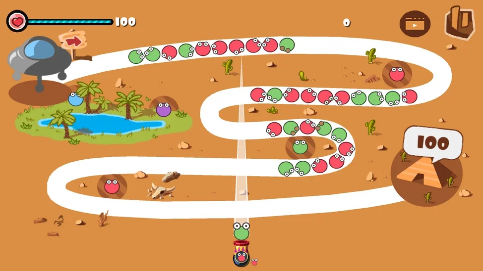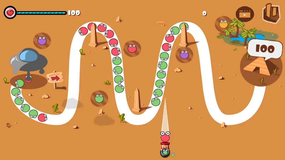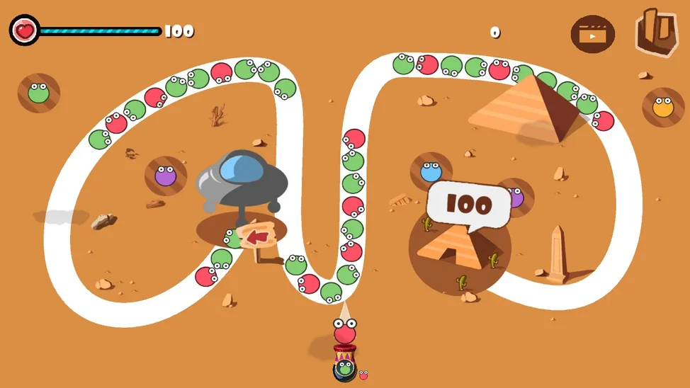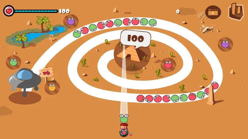 Когда три и более одинаковых по цвету шарика соприкасаются, происходит взрыв. Уничтожьте как можно больше пузырьков, чтобы цветная цепочка не дошла до пирамиды.