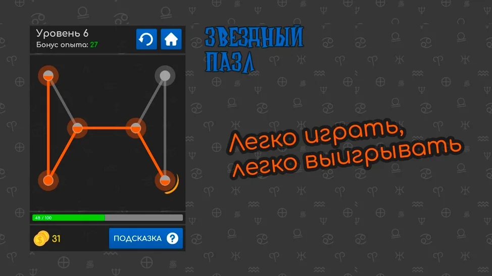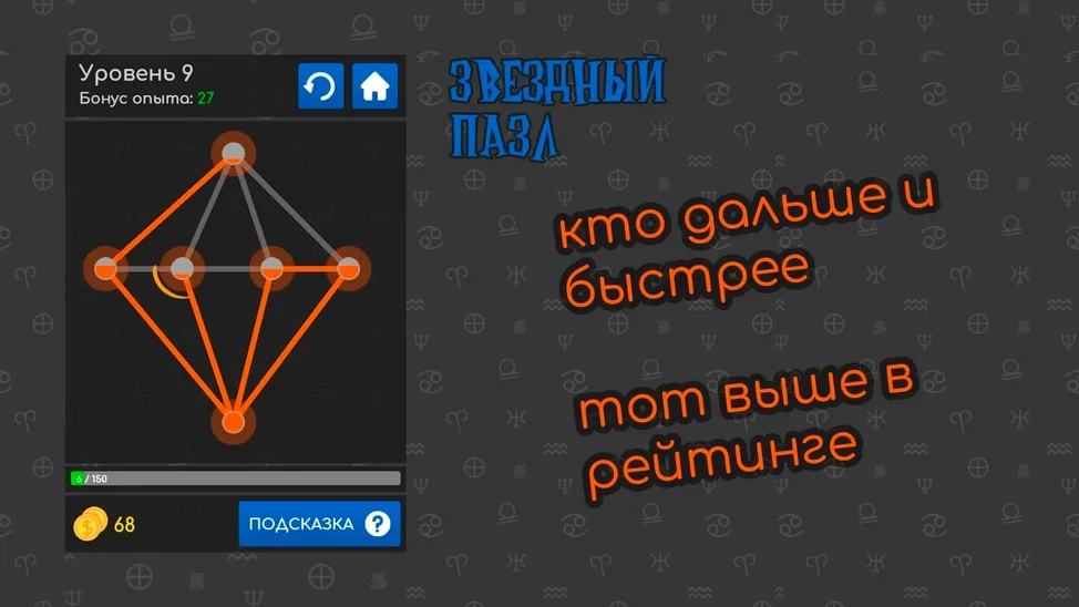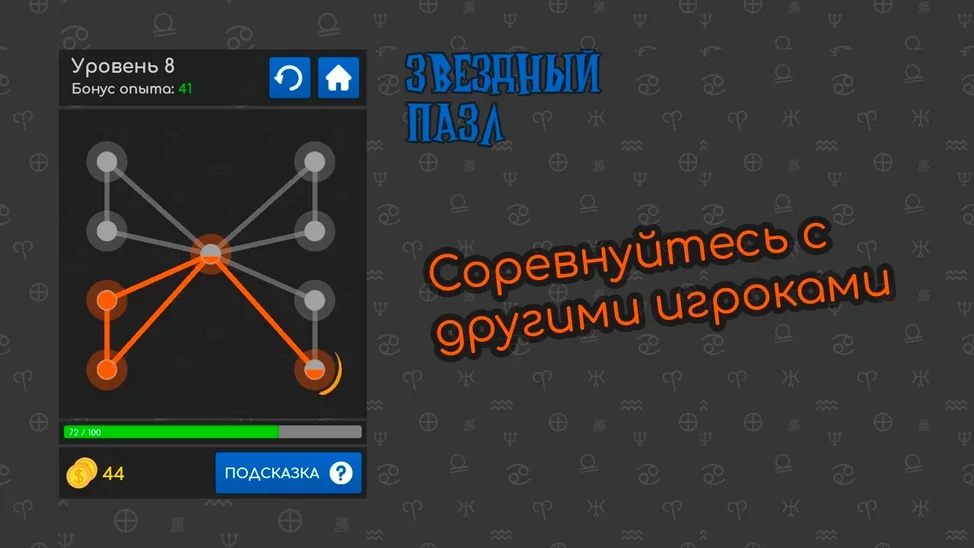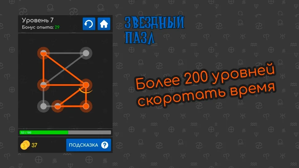 Расслабляющая головоломка, в которой вам предстоит собирать узоры из линий, напоминающие звездные созвездия, соединяя точки между собой. Проходя уровни быстро, ты можешь посоревноваться за место в рейтинге!